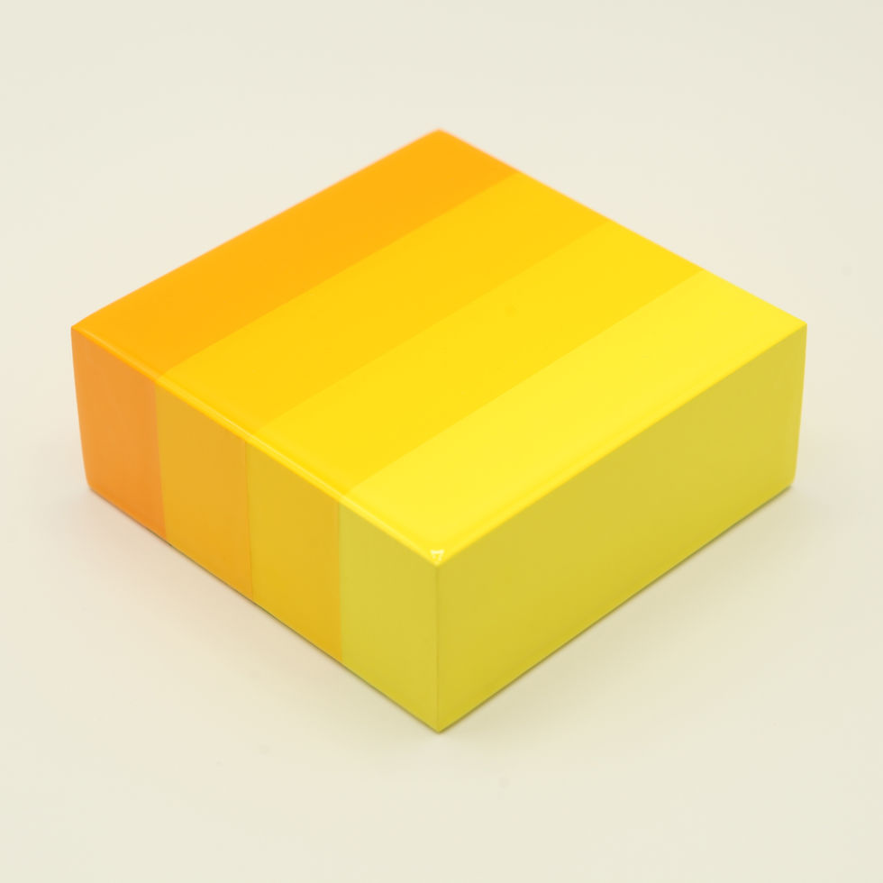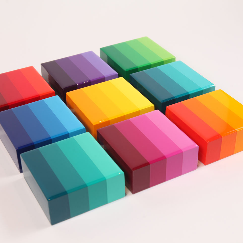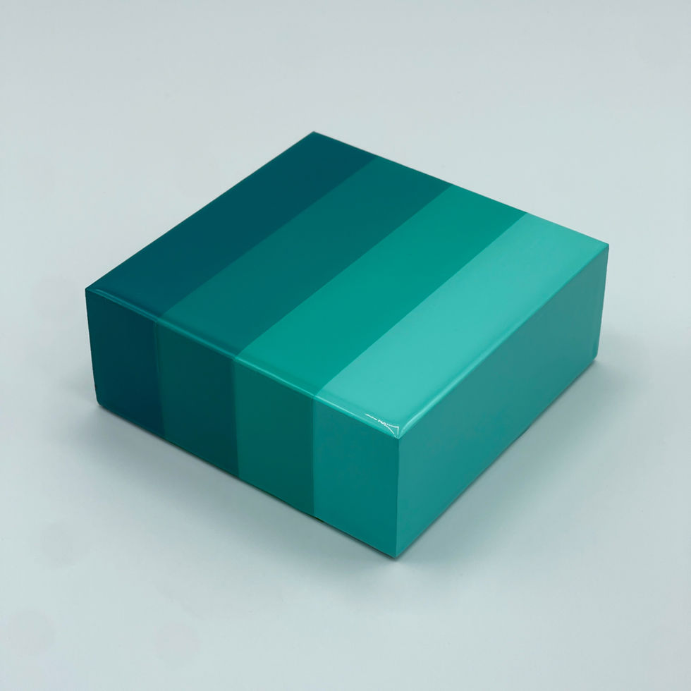 The American made Birch wood panels are 4x4x1 5/8-inch thick, using Golden acrylic paints and Gold or Silver Leaf (where applicable). Each piece is then finished with epoxy resin to give it Jarrad’s trademark glass-like finish.