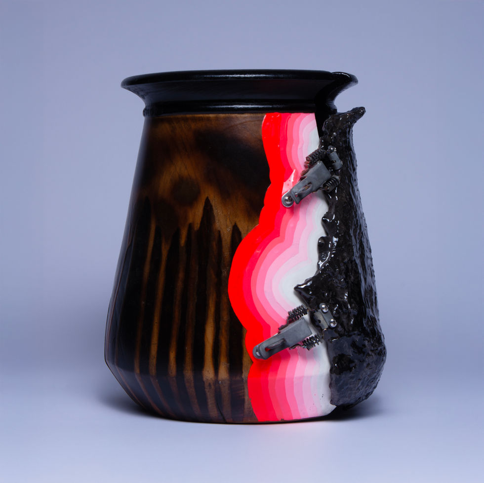 A sculptural wooden vessel with layered pink stripes, fitted with a black ceramic plate and held together by metallic clips.